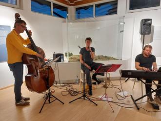 Die Lesung wurde durch musikalische Zwischenspiele des Lemmata Jazz Trios begleitet, das mit seinen passenden und mitreißenden Klängen für eine angenehme Atmosphäre sorgte. Das Trio besteht aus Philip Wipfel am Kontrabass, Stefan Weißleder am Klavier und Johanna Schäfer-Brugger, die Gesang und Flügelhorn meisterhaft präsentierte.