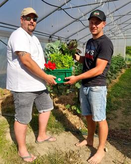 Robert aus Fridolfing (links) war einer der ersten Neuabonennten, der sich seine Gemüsekiste bei Biobauer Markus Hager abholte. Bald ist der Brokkoli reif, dann kommt auch er in die Abokiste, freut sich Markus Hager. Auch Mangold gibt es bei Markus Hager zu erwerben.
