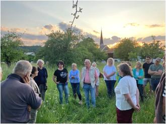 Kirchanschöring. Bei einer Obstwiesenführung auf dem Lapperanger in der Ortsmitte von Kirchanschöring konnten gut 20 Teilnehmende bei herrlicher Abendstimmung alte Obstbäume und typische Wiesenblumen kennenlernen.