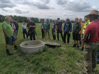 Landwirte und Multiplikatoren informieren sich über Feuchtgrünland und Paludikulturen auf der Versuchsstation Karolinenfeld der Bayerischen Staatsgüter. Links im Bild: Johann Pflügler, Projekleiter; in der Mitte ein Schachtring. Dort laufen die Dränrohre zusammen. Wasser kann somit angestaut oder abgelassen werden.