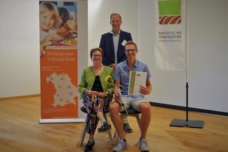 Urkundenverleihung am AELF Ebersberg-Erding, von links: Irmgard Reischl (Leiterin Vernetzungsstelle Kita- und Schulverpflegung), Reinhard Menzel (Behördenleiter Amt für Ernährung, Landwirtschaft und Forsten Ebersberg-Erding), Samuel Bienzle (Verpflegungsbeauftragter der Schule)
