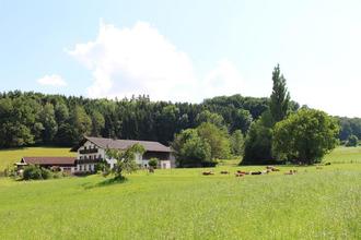 Der Heinrichhof ist herrlich gelegen. Er steht in Hucking auf einer leichten Anhöhe oberhalb von Taching am See. Man hat einen wunderbaren Blick in Richtung See und die ihn umgebende hügelige Landschaft. Auch bei sommerlichen Temperaturen ist es dort gut auszuhalten, weil immer eine frische, angenehme Brise weht. Zum Hof gehören etwa 11 Hektar Grünland, die sich direkt um den Betrieb erstrecken. Acker haben sie keinen.