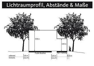 | • | Über die Fahrbahn ragende Äste und Zweige von Baumkronen oder Sträuchern sind so zurückzuschneiden, dass der Luftraum über der Straße mit einer lichten Höhe von 4,50 m über der Fahrbahn und den Straßenbanketten freigehalten wird. |