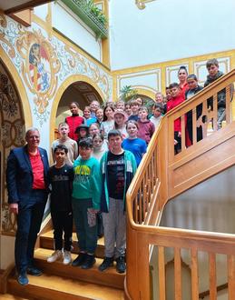 Mitte Mai besuchten die 4. Klassen der Grundschule Trostberg das Rathaus in der Altstadt. Die Schülerinnen und Schüler waren aufgeregt, als sie von Bürgermeister Karl Schleid persönlich empfangen wurden. Er begrüßte seine jungen Ehrengäste ganz herzlich. Sie nahmen im großen Sitzungssaal, an dem Tisch an dem sonst der Trostberger Stadtrat tagt, Platz. Mit Hilfe einer kurzen Präsentation bekamen die Schülerinnen und Schüler einen Einblick in die Geschichte Trostbergs und das aktuelle Stadtleben. Darin fanden sich auch reichlich Antworten auf die vielen Fragen der Klasse, die sie sich bereits lange vor dem Rathausbesuch überlegt hatte. Am Ende durften die Gäste noch das Vorzimmer und das Büro des Bürgermeisters unter die Lupe nehmen. Auch die Trostberger Bürgermeisterkette wurde mit großen Augen bewundert. Diese trägt Bürgermeister Schleid nur bei ganz besonderen Anlässen, wie z. B. Trauungen. Danach ging es für die Klasse mit vielen neuen Eindrücken zurück in die Schule.