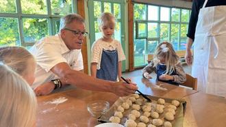 Bürgermeister Schleid mit den Kindern beim Backen der Brote in der städtischen Kindertagesstätte Regenbogen