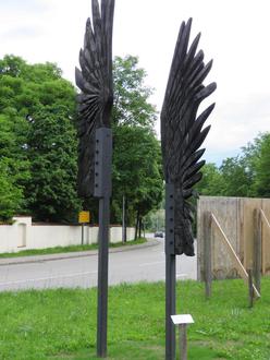 Seit Kurzem ist in Schedling, an der Ausfahrt zur Altöttinger Straße, ein neues Kunstwerk zu bewundern. Es trägt den Titel „… So breiteten sie die Flügel aus…“ und stammt von der Künstlerin Verena Stuhlreiter. Das beeindruckende Kunstwerk mit fünf Metern Höhe besteht aus Pappelholz, das mit der Kettensäge geschnitten und mit dem Schnitzeisen ausgearbeitet wurde. Anschließend wurde es mit dem Bunsenbrenner angebrannt und auf Stahlträgern befestigt.