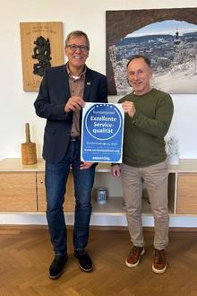 Im Anschluss an die Vorstellung der Ergebnisse präsentierten 1. Bürgermeister Karl Schleid und Geschäftsführer Stefan Bratzdrum das übersandte Siegel über die „exzellente Servicequalität“.