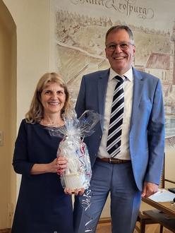 Bürgermeister Schleid überreichte Dr. Birgit Seeholzer als Abschiedsgeschenk den Pienzenauer aus Porzellan.