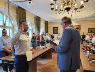 Zu Beginn der jüngsten Stadtratssitzung am 28.06.2023 wurde das neue Ratsmitglied, Dominic Geiger, durch Bürgermeister Schleid eingeführt und vereidigt. Der Stadtrat stimmte dem Wechsel, sowie den damit verbundenen personellen Änderungen bei der Gremiumsbesetzung, ohne Gegenstimme zu.