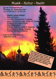 Nach dem großen Erfolg der Herbstserenade im letzten Jahr veranstaltet die Evangelische Christusgemeinde Trostberg wieder eine Musik-Kultur-Nacht, und zwar am Freitag, den 22. September 2023 von 18 bis ca. 22 Uhr in der Christuskirche. Unter der Leitung von Pfarrer i. R. Johannes Arendt gibt es ein Treffen von Musikern, die auch konfessionsübergreifend im weitesten Sinne mit Kirche zu tun haben. Dies sind unter anderem die Clownin Imma Fröhlich, Wolfgang Schneider an der Orgel, die Harfistin Sanna Meisner, Thomas Hartmann am Klavier, Claudia Judex mit den Jugendlichen Laura, Felix und Quirin, Wolfram Hoffmann mit Gitarre sowie der Chor Weizenkorn und der Chor der Christuskirche Trostberg. Der Eintritt ist frei, die eingenommen Spenden auch für das angebotene Essen werden zur Finanzierung eines barrierefreien Zugangs zu den Räumlichkeiten unterm Kirchendach verwendet.