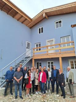Die Trostberger Stadtratsmitglieder mit Evi Schenkl, der Leiterin des SozialRaums (hinten Mitte), und Bürgermeister Karl Schleid (3. von links) vor dem fast fertiggestellten Gebäude der Traunsteiner Straße 10.