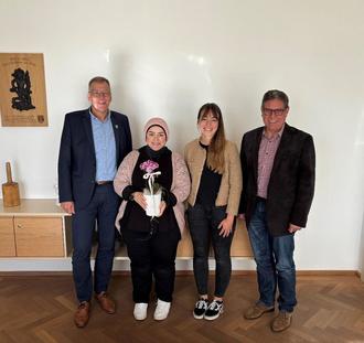 Von links: Bürgermeister Karl Schleid, Basma Alshaar, Cornelia Ksionsko (Kindergartenleiterin), Stadtkämmerer Armin Gois