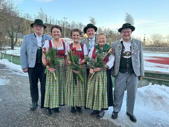 Für außerordentliche Verdienste und 50- jährige aktive Mitgliedschaft beim Trachtenverein durfte Franz Mussner zum Ehrenfähnrich ernannt werden. Zu weiteren Ehrenmitgliedern wurden die aktiven Röckifrauen Angelika Zimmermann, Helma Freutsmiedl und Elfriede Frank ernannt. Auch Sepp Freutsmiedl, als amtierender 1. Vorsitzender und Ehrenkassier zählt zu den Jubilaren, und kann auf 50 Jahre aktive Mitgliedschaft zurückblicken. Den Jubilaren wurde mit einer Urkunde und einem Blumenarrangement gedankt. Bevor der besinnliche teil begann, der mit einem Weihnachtslied und dem Nikolausbesuch bereichert wurde, lobte Sepp Freutsmiedl den Zusammenhalt und die Treue im Verein, und bedankte sich bei allen Mitgliedern dafür.