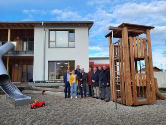 Die kleine Leni freute sich über das neue Spielgerät und über den Besuch ihres Opas, Bürgermeister Schleid, in der Kita Tatütata und begleitete ihn zum Gruppenfoto.