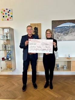 Erster Bürgermeister Schleid und Frau Gabriele Brunsch von der Christophorus Apotheke bei der Scheckübergabe.