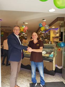 Bürgermeister Schleid mit Herrn De Lorenzi Cancelier bei der Eröffnung des Eiscafé Veneto in der Hauptstraße