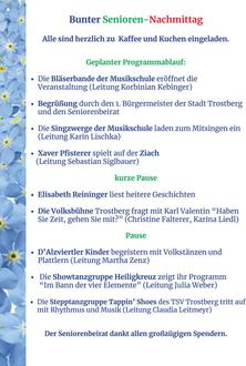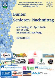 Am Freitag, dem 17.4.2026 um 14.00 Uhr sind alle Trostberger Bürgerinnen und Bürger Ü60 eingeladen, einen unterhaltsamen Frühlingsnachmittag zu genießen. Das Programm gestalten u. a. Kinder und Jugendliche der Musikschule, Trostberger Vereine und Theatergruppen.