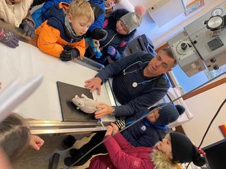 Jedes mitgebrachte Kuscheltier wurde vom Arzt und seiner Assistentin untersucht, abgehorcht und entsprechend verarztet: So bekam das Häschen mit verstauchter Pfote einen Verband und sogar das Schweinchen mit Schnupfen ein paar Nasentropfen.
