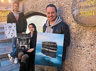 Im „Trostberger Fenster“ und im Postsaal präsentieren Bella Kilian und Felix Huber ihre Fotografien – auf Initiative von Holger Eschenmüller (links) und Markus Lange (nicht im Bild) – ihre Fotografien.