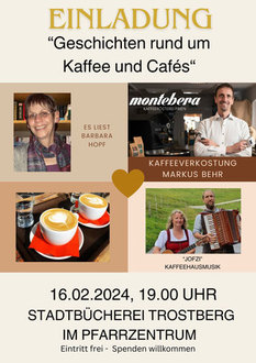 Rund um Kaffee und Cafés geht es bei einer Lesung in der Stadtbücherei St. Andreas Trostberg am Freitag, 16. Februar, um 19.00 Uhr. Barbara Hopf liest kurzweilige Geschichten und Texte, umrahmt von der Kaffeehausmusik "JOFZI". Für den passenden Duft in der Bücherei sorgt Kaffeeröster Markus Behr aus Prien. Natürlich wird der Kaffee auch verkostet, auch für passende kulinarische Kleinigkeiten ist gesorgt. Das Büchereiteam freut sich auf viele Besucher und nette Gespräche in Kaffeehaus-Atmosphäre. Der Eintritt ist frei, Spenden sind willkommen.