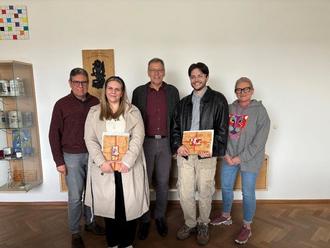 Von links: Stadtkämmerer Armin Gois, Nasira Weinberger, Erster Bürgermeister Karl Schleid, Jan Sojer, Leiterin KiTa Regenbogen Christine Eckert-Fix
