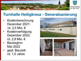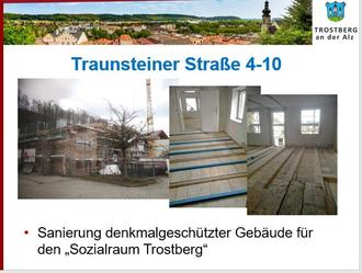 Die Generalsanierung der Heiligkreuzer Turnhalle läuft. Die Halle wurde auf Rohbauzustand gesetzt. Inzwischen wurde das Hallendach erneuert und der Trockenbau teilweise erstellt. Weitere Maßnahmen gehen vonstatten. Die Sanierungsarbeiten an den Häusern in der Traunsteiner Straße 4-10 für den „SozialRaum Trostberg“ schreiten ebenfalls voran. Die historisch nicht relevanten Gebäudeteile wurden rückgebaut. Auf Grund von Asbest-Funden musste, wie bereits bekannt, leider ein längerer Baustopp in Kauf genommen werden. Als nächstes wurden die Dächer saniert. Inzwischen sind weitere Arbeiten, wie Zimmerarbeiten-, Putz- und Stuckarbeiten- oder Schreinerarbeiten usw. bereits vergeben. Weitere Gewerke wie die Fliesenarbeiten, Außenanlagen bis hin Bauendreinigung folgen bzw. sind schon ausgeschrieben. Die Fertigstellung ist Ende 2023 geplant.