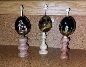 Das Ei – Bei zahllosen Völkern symbolisiert das Ei Fruchtbarkeit, Leben, Gesundheit, Liebe, Harmonie. Im Christentum steht es für die Auferstehung und das ewige Leben. Aber nicht nur im Kulturbereich spielt das Ei eine wichtige Rolle. Als wertvolles Lebensmittel findet das vielseitige Hühnerei Verwendung. Treffend formulierte Wilhelm Busch: „Das weiß ein jeder, wer’s auch sei, gesund und stärkend ist das Ei“. Äußerst interessant ist, wie die Schale der Eier in den verschiedensten Techniken gestaltet werden kann: gefärbt, bemalt, gekratzt, gebohrt, bestickt, behäkelt, beschriftet, gebatikt, beklebt … Wahre Wunderwerke und enormer Einfallsreichtum sind zu bestaunen. Die meisten meiner Eier sind mit Batikfarben und Tusche gefärbt, die Muster teilweise vorgezeichnet und dann mit handelsüblichen Abbrechmessern die Farbe entfernt. Wenn ein Ei das Ausblasen überstanden hat, ist es ziemlich stabil und kann gut bearbeitet werden.