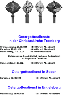 | 11.15 Uhr | Gottesdienst am Ostermontag mit Abendmahl |