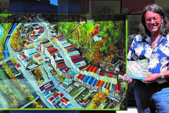 Herausgeber Oliver Amler vor dem Schaufenster in der Hauptstr. 1, in dem das original Ölbild von Peter Amler auf der Titelseite zu sehen ist.
