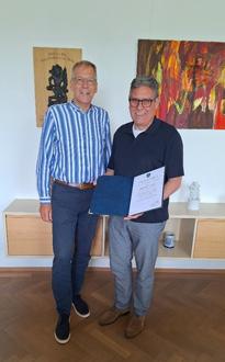 Bei der Übergabe der Jubiläumsurkunde im Bürgermeisterbüro: Bürgermeister Karl Schleid (links) mit Stadtkämmerer Armin Gois (rechts).