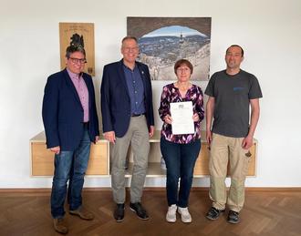 Von links Stadtkämmerer Armin Gois, Bürgermeister Karl Schleid, Jubilarin Lidia Eckert, Personalratsvorsitzender Martin Gastager