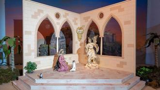 Mit den bis zu 40 cm großen Figuren zeigt das erste Bild auf der 3,1 m breiten und 1,1 m hohen „Bühne" die Verkündigung Mariens durch den Erzengel Gabriel.