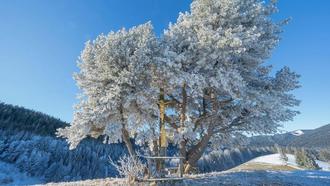 Wegkreuz auf der Fürmann Alm mit dem weiten Blick rechts hinüber zur verschneiten Gebiet der Stoißer Alm auf dem Teisenberg
