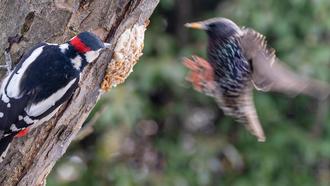 Der Buntspecht beobachtet neugierig den rasant an den am Baumstamm bereitgestellten Futterplatz anfliegenden Star.