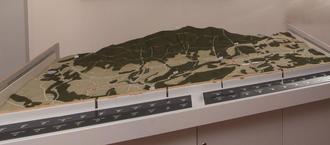Das Modell zeigt den Höhenzug des Teisenbergs von Norden her gesehen mit den Ortschaften am Fuße und dem weiten Land vor dem Teisenberg....