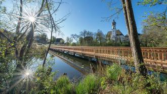 Unten am Höglwörther See macht der neu fertiggestellte Steg den so beliebten Rundweg um den See wieder möglich. Der Höglwörther See läuft über den Rauschbach, der sich später Ramsaubach nennt, richtung Teisendorf zur Sur ab. Diesen Rauschbach überquerte seit Jahrzehnten und jetzt aufs Neue der Steg. – Und immer wieder im Blick das herrliche Ensemble des ehemaligen Augustinerchorherrnstift.