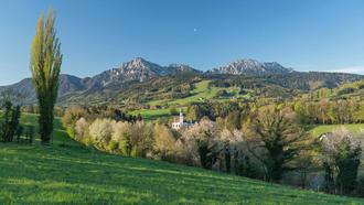 Höglwörth – die Perle des Rupertiwinkels – tief unten liegt das ehemalige Augustinerchorherrnstift mit der Klosterkirche Peter und Paul Höglwörth; im Hintergrund links der Hochstaufen – weiter mit Mittelstaufen und rechts der Zwiesel: der östlichste Gebirgsstock der Chiemgauer Alpen.