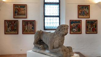 Der romanische Giebellöwe vor den farbenfroh-großformatigen spätgotischen Tafelbildern