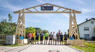 Neukirchen: Nur noch vier Wochen sind es bis zum 150jährigen Gründungsfest der Freiwilligen Feuerwehr Neukirchen. Vom 01. bis 05. August wird gefeiert, erwartet werden viele Gäste nicht nur aus Neukirchen, sondern aus der ganzen Marktgemeinde Teisendorf und der Region. Alle die kommen, werden auf dem Weg zum Festzelt den großen Triumphbogen aus Holz durchschreiten, den die Mitglieder des Festausschusses und andere Helfer in Handarbeit angefertigt haben. Am letzten Wochenende im Juli wurde der Bogen im Pfarrhofweg, in etwa auf Höhe des Pfarrhofs aufgestellt. Rund fünfzehn Helfer waren an der Aktion beteiligt und haben mitgeholfen die Teile anzufahren, sie schrittweise zusammenfügen und zusammenschrauben, die Pfeiler mit Brettern zu verkleiden und natürlich zuletzt auch aufzuräumen. Dazwischen gabs auch mal eine Verschnaufpause bei einem gemeinsamen Mittagessen. Das aus heimischem Fichtenholz kunstvoll angefertigte Holzkonstrukt ist sechs Meter hoch und überspannt jetzt die ganze Straßenbreite als sichtbares Zeichen, dass es bald los geht mit dem Gründungsfest.