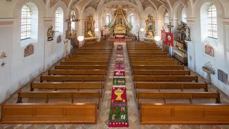Unzählige Blütenblätter bilden in kunstvoll gelegter Arbeit die Motive für dieses Zeugnis gelebten Glaubens zu Fronleichnam.