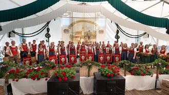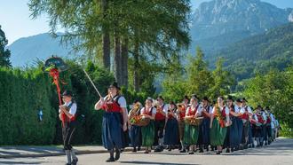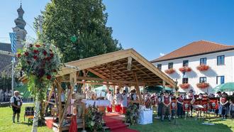 Kaiserwetter zum Festgottesdienst und anschließendem Festumzug begleitet die teilnehmenden Musikkapellen, die Ortsvereine und die vielen an der Zugstrecke applaudierenden Zuschauer.