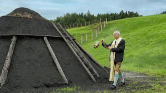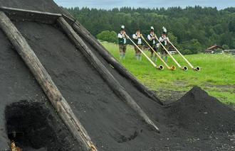 Das Anzünden des Meilers durch die diesjährige Köhlerliesl Maria Langlechner mit Segnung durch Pfarrer Martin Klein und mit musikalischer Begleitung durch die Ruhpoldinger Alphörnbläser
