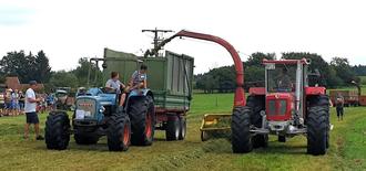 Auch Maschinen der alten Landtechnik, zum Beispiel für das Mähen, Wenden, Schwaden, Häckseln, Dreschen waren ausgestellt. Die meisten waren noch einsatztüchtig, einige davon konnten sogar in voller Aktion bewundert werden. So ein Schlüter 1250 Oldtimertraktor, der einen Anhängehäcksler New Holland 717 zog. Das Hackgut wurde in einem Eicher-Wotan II Oldtimertraktor mit Kipper aufgefangen. Die historischen Vorführungen bei den Bulldogtreffen in Helming ziehen immer sehr viele Zuschauer an. Vor allem bei den älteren Besuchern werden dabei Erinnerungen wach an die Anfangsjahre der Mechanisierung in der Landwirtschaft. Diese Erinnerungen aufrecht zu erhalten ist ein wichtiges Ziel des Teisendorfer Vereins, der sich vollständig „Bulldog- und Landmaschinenerhaltungsverein“ benennt. „Der Erhalt von Maschinen und Arbeitsweisen der früheren Landwirtschaft als Teil der Geschichte des Landes liegt uns am Herzen“, so 1.Vorstand Peter Lamminger. Und Helmut Unterreiner, 2.Vorstand, ergänzt „Wir bekommen dafür viel Lob nicht nur von der Bevölkerung, sondern auch von anderen Bulldogvereinen aus der Region und darüber hinaus“.