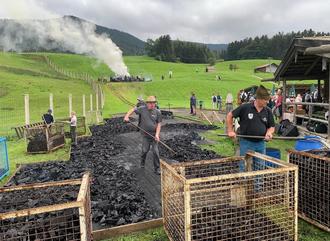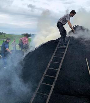 Pünktlich um zehn Uhr wurde mit dem Ernten der Kohle begonnen. Dazu entfernten die Helfer die Kohllösche, hier Koilisch genannt, die den Meiler luftdicht gemacht hatte. Die heiße Kohle wurde mit Gabeln und Schaufeln abgetragen und in Blechbottichen gefüllt. Die vollen Bottiche wurden in eine Lore ausgeleert, die die Kohle auf einem Gleis zu Tale beförderte. Dort warteten bereits weitere Helfer, um sie zu leeren und die Kohle auf einem Podest zum Auskühlen auszubreiten. Die leere Lore wurde an einer Kette wieder nach oben gezogen. Der Vorgang wiederholte sich den ganzen Tag über, bis der Meiler um etwa 16 Uhr zur Gänze abgetragen war. Nach getaner Arbeit zogen die Köhler gemeinsam mit dem Köhlerliesel Monika Schmid und der 1.Vorständin Stephanie Enzinger, unter den Klängen der Hi und Di Musi von der Anhöhe zum Festplatz bei der Köhlerhütte. Die diesjährige Verkohlung war damit zwar beendet, gefeiert wurde aber noch weiter, denn die Helfer hatten nach dem anstrengenden Tag eine Stärkung redlich verdient.