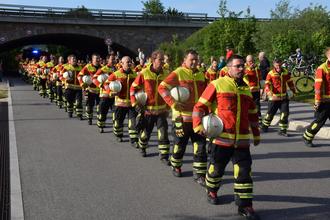 Festumzug in Einsatzkleidung vom alten zum neuen Gerätehaus