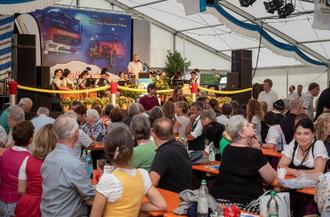 Um 17 Uhr trafen die ersten Gäste im festlich dekorierten Zelt ein. Die gesamte Belegschaft der Pidinger Werkstätten kam zusammen, um in den ersten beiden Stunden in aller Gemütlichkeit und unbeengt zu Abend zu essen und ein entspanntes Unterhaltungsprogramm zu genießen. Nachdem es hervorragend gemundet hatte (die Brathendl waren der Renner) und eine gemütliche Tanzlmusik aufspielte, füllte sich die Fläche vor der Bühne rasch mit fröhlichen Tänzern. Es gab am frühen Abend zwei bejubelte Auftritte der Tanzgruppe der Werkstatt (an der Ziach beim „Bauernmadl“ traditionell der Geschäftsführer der PWLH, Hermann Seeböck) und die ersten Auftritte des Showprogramms: Junge Artisten vom Zirkus Buchenhöhe – von Lampenfieber keine Spur- und der Jongleur Martin Fürhaupter beeindruckten mit ihrer Akrobatik und erhielten großen Applaus.