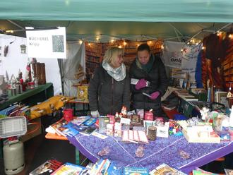 Der Stand der Bücherei auf dem Kripper Weihnachtsmarkt mit Waltraud Mertens vom Weltladen-Team und Stefani Jürries vom Bücherei-Team