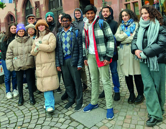 REMAGEN / FRANKFURT. Auseinandersetzung mit Demokratiegeschichte stand am Campus Remagen im Wintersemester auf dem Vorlesungsplan: Im Dezember unternahmen acht Austauschstudierende der Hochschule Koblenz zusammen mit einigen ihrer „Buddies“ eine Exkursion in die Mainmetropole Frankfurt. Bereits während der Orientierungswoche hatten sich die Studierenden mit Geschichte und Landeskunde beschäftigt. Diese Thematik wurde im Rahmen der Lehrveranstaltung „Deutsch als Fremdsprache“ von Annette Holzapfel weiter vertieft. Dabei entstand die Idee, eine Exkursion nach Frankfurt durchzuführen und diese durch die Bearbeitung von verschieden Kurzreferaten zu den Erinnerungsstätten Frankfurts inhaltlich ausgestalten zu lassen. Nach Eintreffen der Gruppe am Frankfurter Hauptbahnhof konnten die jungen Leute auf dem Fußweg zum „Römer“, dem historischen Rathaus, die Hochhäuser deutscher Großbanken bestaunen. Elda Halili aus Albanien hatte Informationen zu Frankfurts Finanzwelt zusammengestellt. Erste Station des Stadtrundgangs war Goethes Geburtshaus. Der Kurzvortrag von Rindi Gjikolli, ebenfalls aus Albanien, über die vielfältigen Facetten des deutschen Dichtergelehrten, motivierte einige Exkursionsteilnehmende das Goethehaus unmittelbar danach zu besuchen. Am „Römer“ nahm Dr. Kai-Michael Sprenger, Gründungsdirektor der Stiftung der Orte der deutschen Demokratiegeschichte mit Sitz in Frankfurt, die Gruppe in Empfang. Der Historiker erklärte ihnen die Entstehung des deutschen Föderalismus und das mittelalterliche Wahlkönigtum sowie, was es für Frankfurt bedeutete, freie Reichsstadt zu sein. Beim anschließenden Besuch der Paulskirche berichtete Krishna Kothamasu aus Indien von der Sitzung der 1. Deutschen Nationalversammlung im Jahr 1848. Historiker Sprenger vermittelte den Studierenden spannende Details der deutschen Demokratie- und Nachkriegsgeschichte. Zum Schluss erklärte er ihnen den Ursprung der deutschen Flagge und die Bedeutung der Worte „Nie wieder! Nie wieder! Immer wieder!“, das Bekenntnis Deutschlands gegen Krieg, Faschismus und Holocaust sowie für den Aufbau der Demokratie. Selsela Arya, Betreuerin für Incoming Students am RheinAhrCampus, zeigte sich begeistert von dieser Initiative: „Besonders danke ich Herrn Dr. Sprenger, der seine Zeit unseren Studierenden zur Verfügung gestellt und ihnen so eine intensive Auseinandersetzung mit zentralen Aspekten unserer Verfassungskultur ermöglicht hat – aber auch Frau Holzapfel, die diesen Kontakt vermittelt und so die Begegnung ermöglicht und begleitet hat.