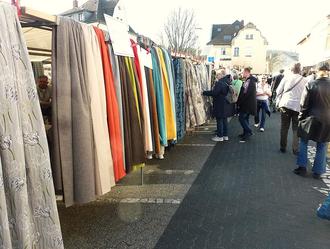 REMAGEN. DG. Am vergangenen Sonntag war es wieder so weit: Die Remagener Innenstadt wurde zum Paradies für Stoffe. Der Frühling ist hierfür sicher die richtige Zeit für Erneuerungen in der Wohnung oder auch, sich schicke Sommerkleidung selbst zu schneidern. Zig Ausstellende, unter anderem auch aus den Niederlanden, boten an ihren schmucken Ständen Textilstoffe aller Art an. Ob nun für Gardinen und Vorhänge, oder für selbst zu schaffende Kleidung, das vielfältige Angebot ließ keine Wünsche offen. An einigen Ständen wurden auch schon fertige Textilien zum Kauf angeboten. Wer mit Stoffen arbeitet, braucht in der Regel auch noch notwendiges Zubehör. Hübsche Bänder, Reißverschlüsse, Knöpfe oder Nähzeug, und was sonst noch so alles benötigt wird, auch das wurde in allen möglichen Variationen feilgeboten. Ergänzend dazu hatten auch Geschäfte in der Innenstadt ihre Türen geöffnet. Und verbinden konnte, wer wollte, den Bummel durch die Straßen noch mit einem Besuch im neu sanierten historischen Rathaus. Da gab es nachmittags nämlich einen „Tag der offenen Tür.“ Auch die örtliche Gastronomie profitierte sicher von den vielen Gästen. Kennzeichnend hierfür die Warteschlangen an den beiden Eisdielen-bei dem Wetter nur allzu verständlich. Der Reigen der Veranstaltungen in der Remagener Innenstadt wurde hiermit stilvoll eröffnet.