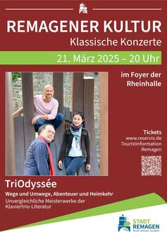 Unter dem Titel „Wege und Umwege, Abenteuer und Heimkehr“ lädt das TriOdyssée am 21. März 2025 zum Abschlusskonzert der aktuellen Spielzeit in das Foyer der Remagener Rheinhalle ein. Nach ihrem erfolgreichen Auftritt in der Spielzeit 2022/2023 kehren die drei renommierten Musiker zurück, um das Publikum mit ihren hochexpressiven Klängen zu begeistern.